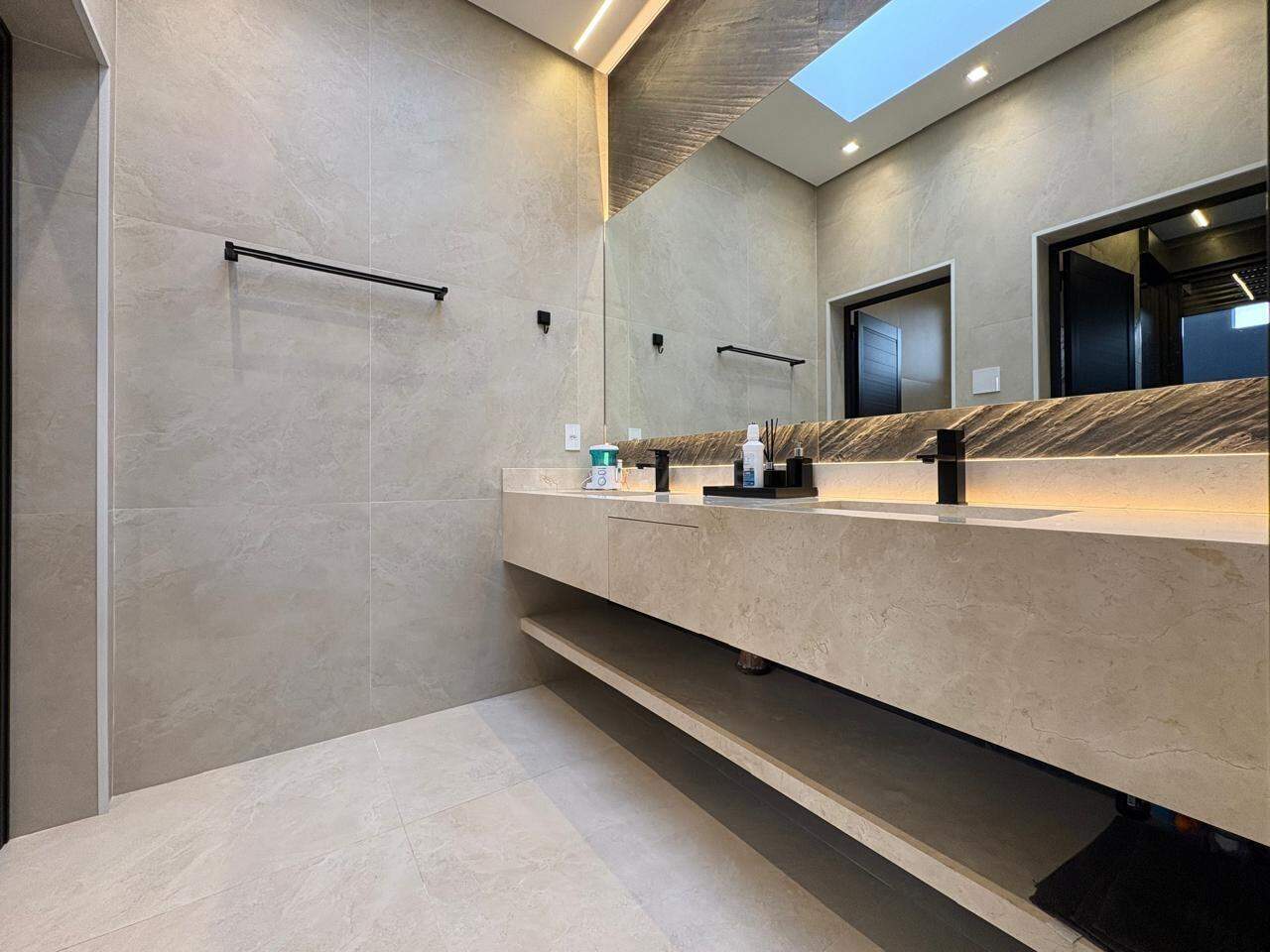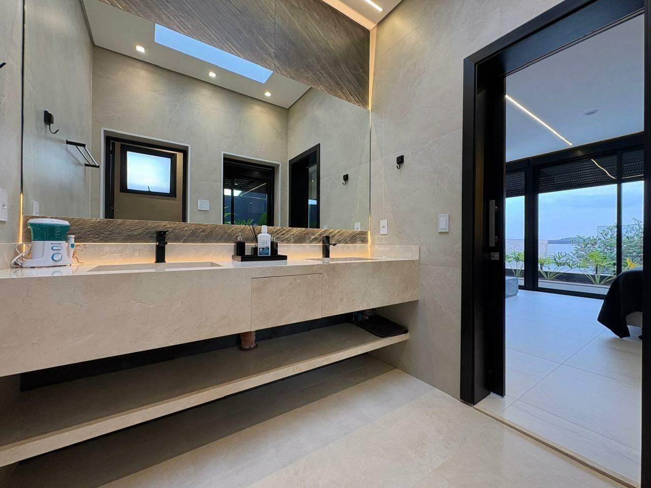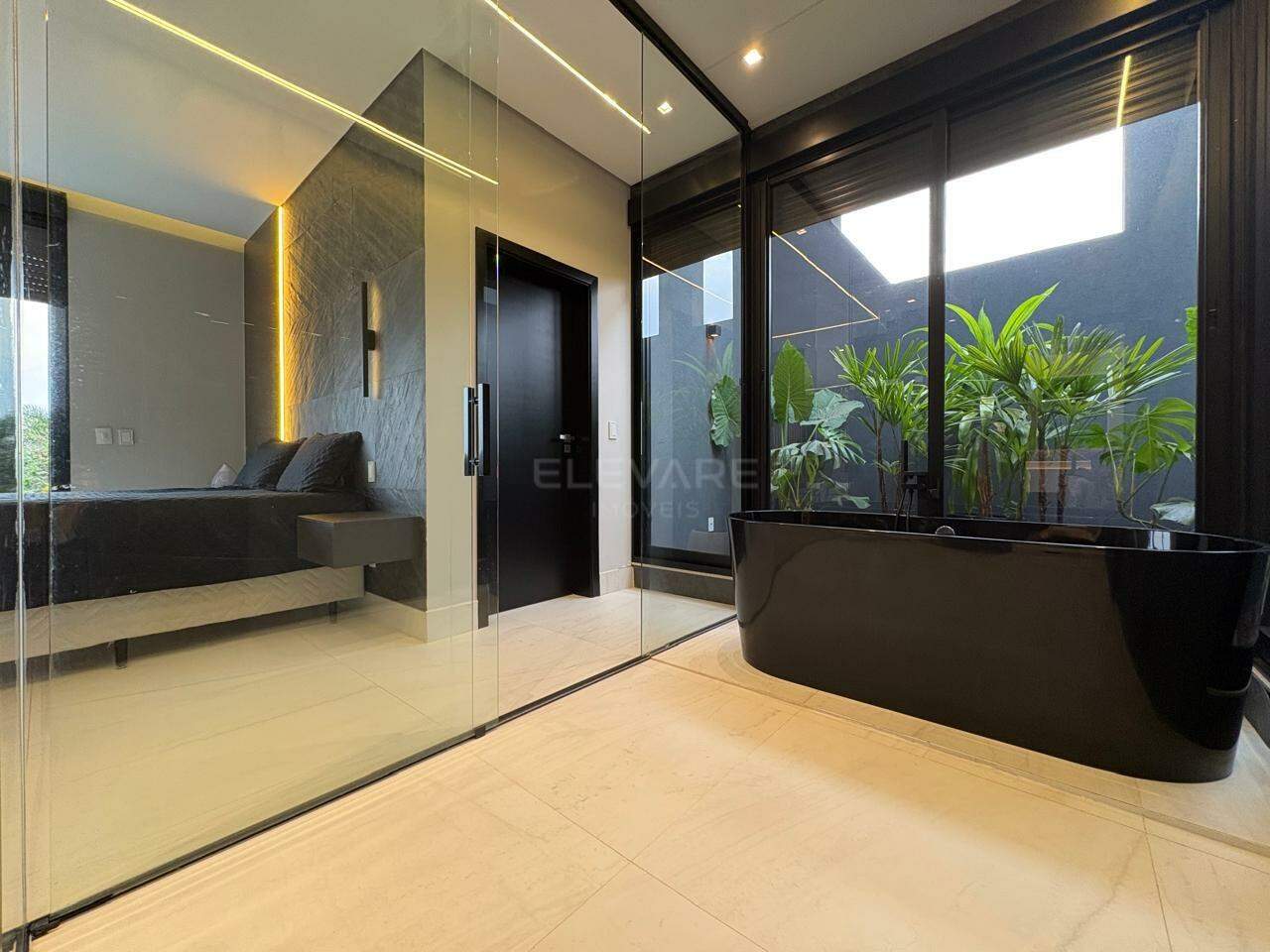 • Suíte master com sala íntima, banheira de imersão, cubas e chuveiros duplos, sauna e vaso sanitário reservado