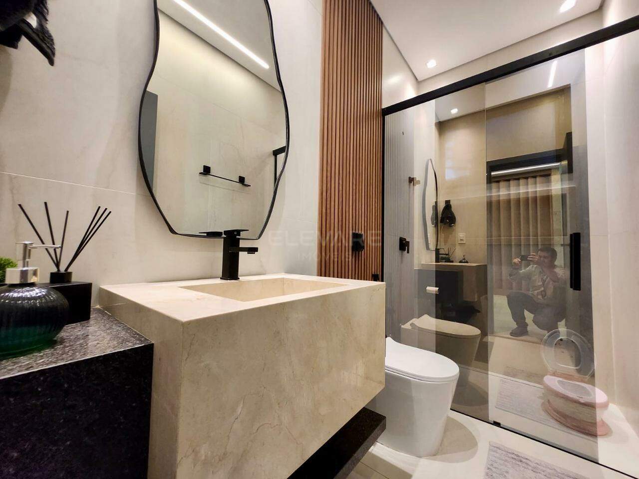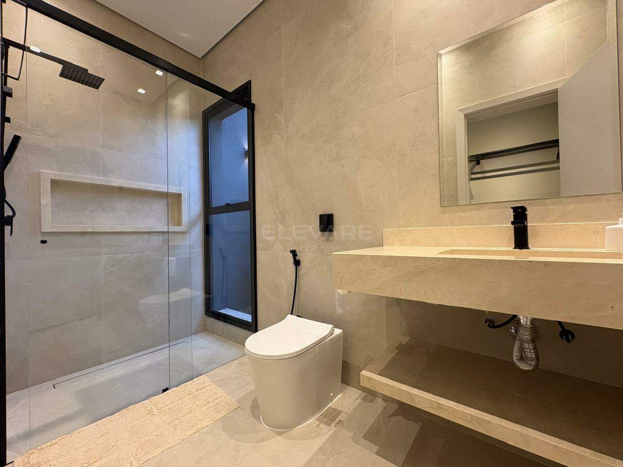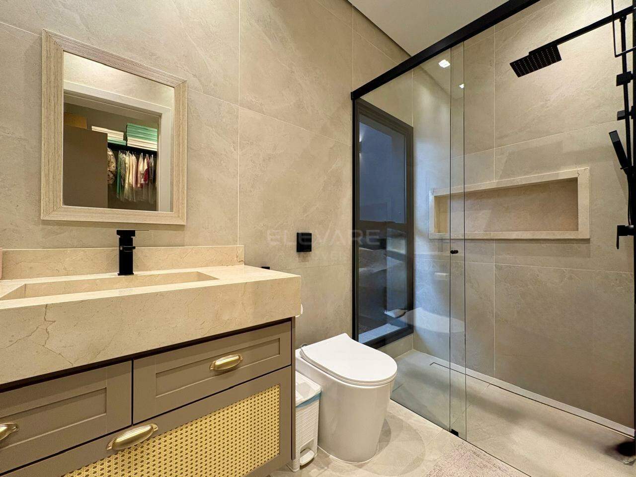 • Suíte master com sala íntima, banheira de imersão, cubas e chuveiros duplos, sauna e vaso sanitário reservado